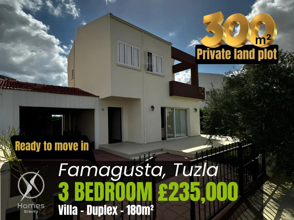 This fully furnished 180 m² duplex villa is located in the peaceful residential area of Tuzla, offering a perfect blend of privacy and proximity to Famagusta’s city services. Set on a 300 m² plot, the home features a mature Mediterranean garden, a closed private garage, and three spacious bedrooms designed for long-term comfort. Its location just 600 meters from the beach and minutes from Eastern Mediterranean University makes it a high-value choice for both retirees and families.